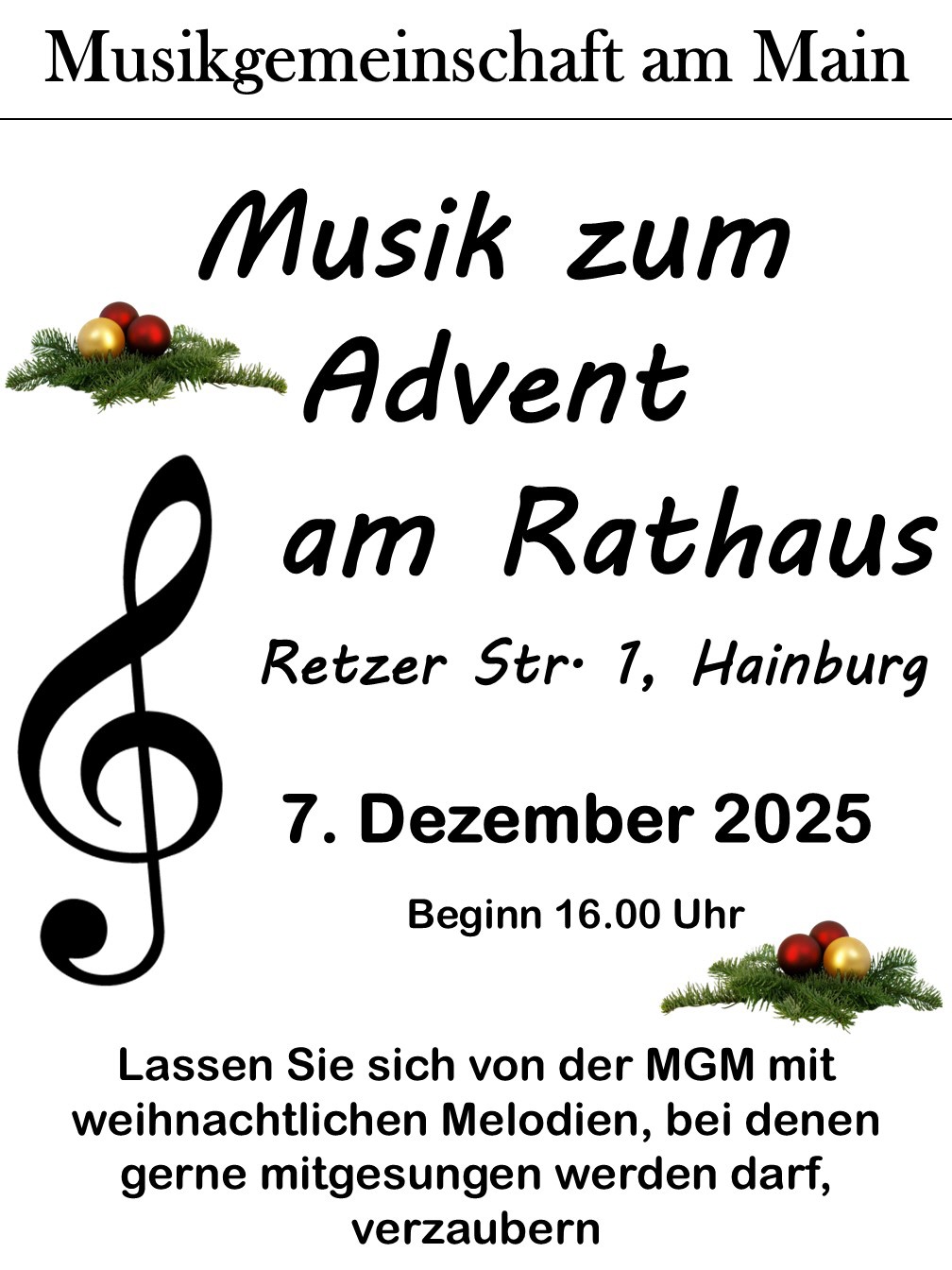 Wie bereits im letzten Jahr möchte die Musikgemeinschaft am Main in der besinnlichen Zeit vor Weihnachten den 2. Advent musikalisch untermalen.
